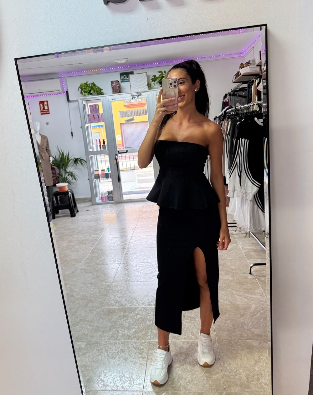 Conjunto de top con volante y falda larga con apertura en el lado.Talla única, da hasta una L.